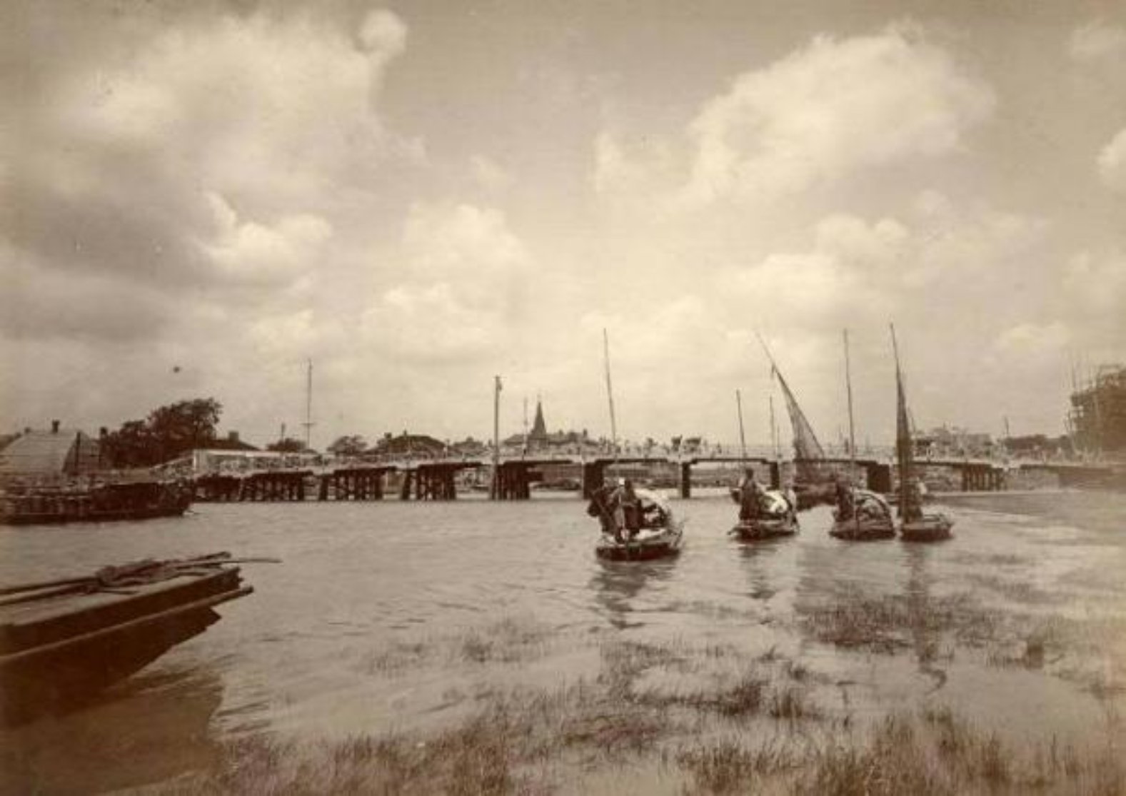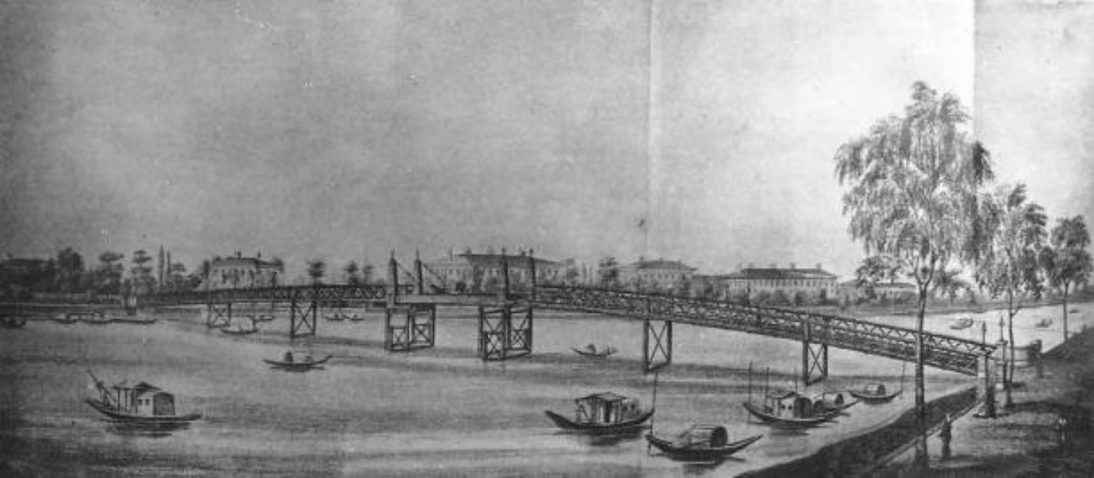 1843年上海开埠之后,苏州河两岸相继被纳入租界范围。1856年,英国商人韦尔斯(C. Wills)、韦勃(Ed W·Webb)、霍格(E. Jenner Hogg)等人集资在苏州河口附近建造了一座木桥,命名为“韦尔斯桥”,通过向行人收取过桥费赚得盆满钵满。