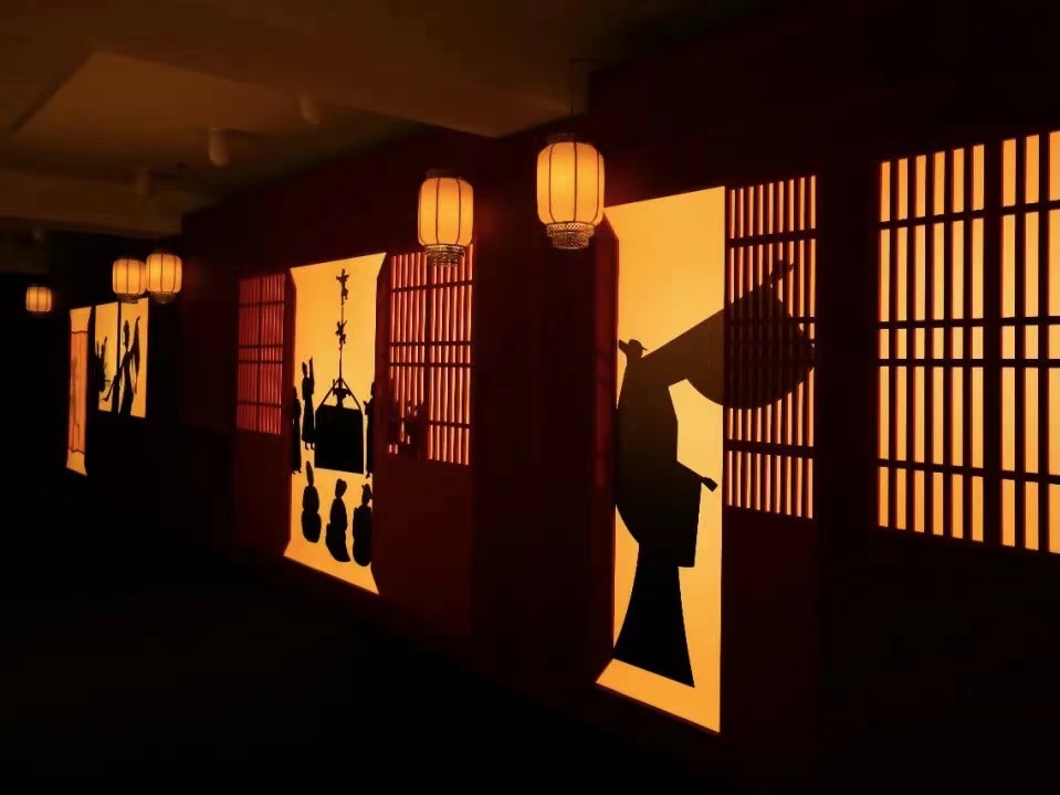 再往里走,邂逅一片热闹的长安街景。民间杂技,酒肆中的胡旋舞,宫廷聚会……窗户内的剪影给人一种奇妙的沉浸感,欲说还休,此刻我们可以与大唐百姓一起感受乐舞带来的愉悦。