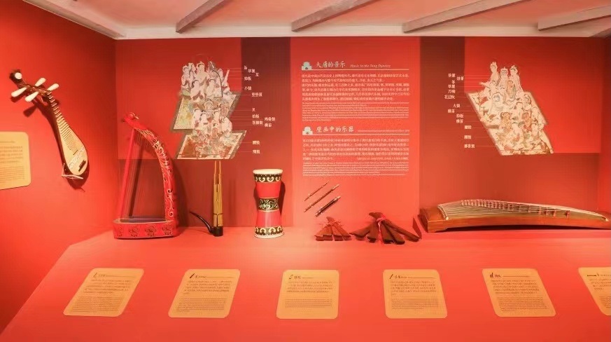 现场展出的仿制乐器,样式便来自壁画中,包括笙、腰鼓、筝、花边阮等。
