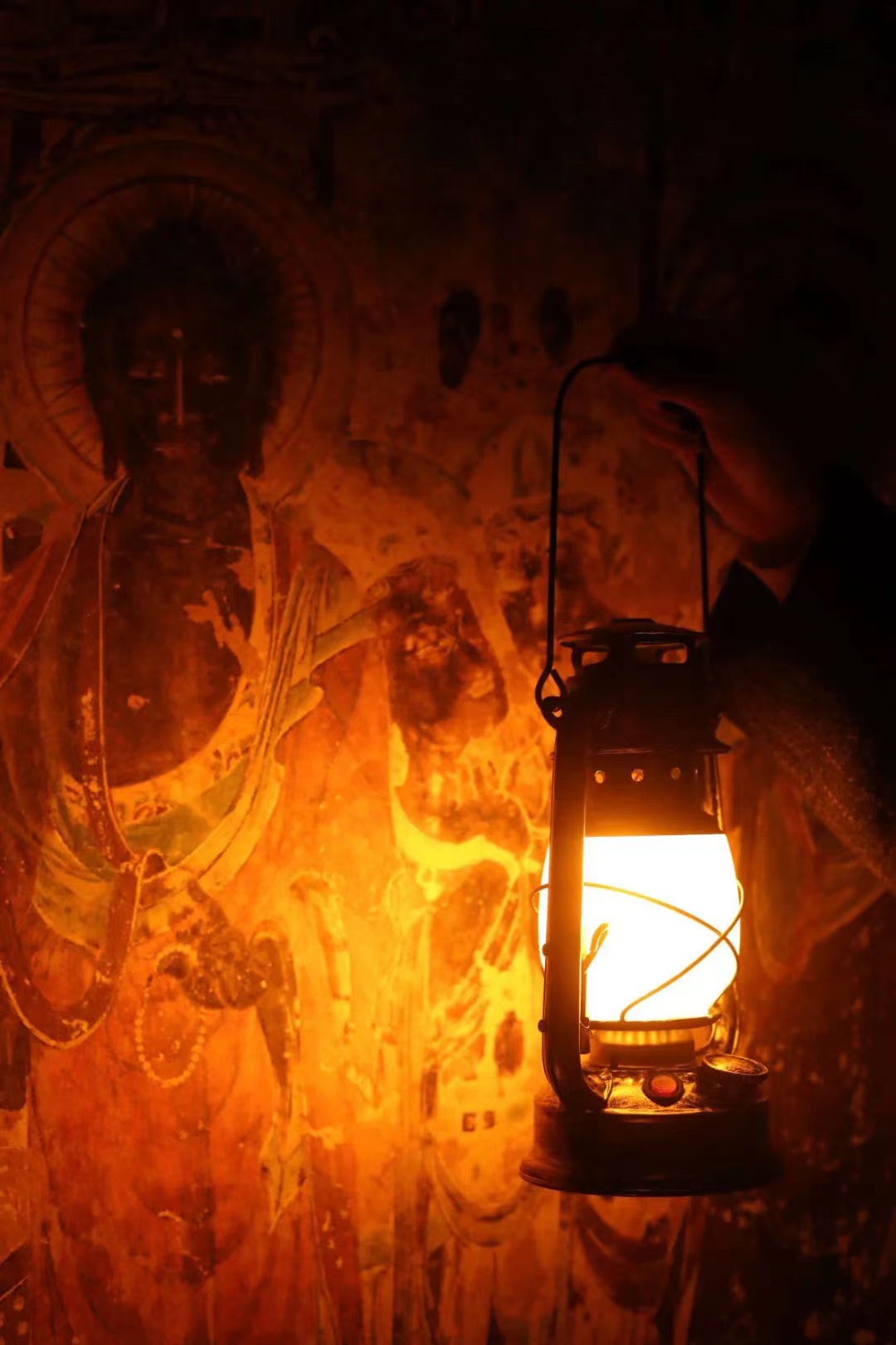 首先吸引大家注意的是由敦煌研究院为展览定制呈现的莫高窟第220窟等比例模型,生动呈现其形制和内容。窟内细节繁多,非常值得驻足细看。走过第一个展厅,通道处也是220窟的复制窟,采用了敦煌研究院数字化研究所制作的高清图像。观众提灯照壁画,仿佛此时就置身于莫高窟洞窟之内,简直身临其境,美轮美奂。