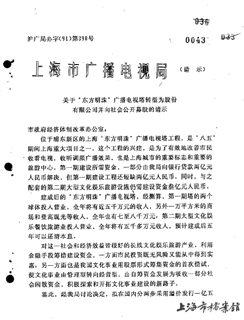 东方明珠转型为股份制企业的相关档案(上海市档案馆藏)