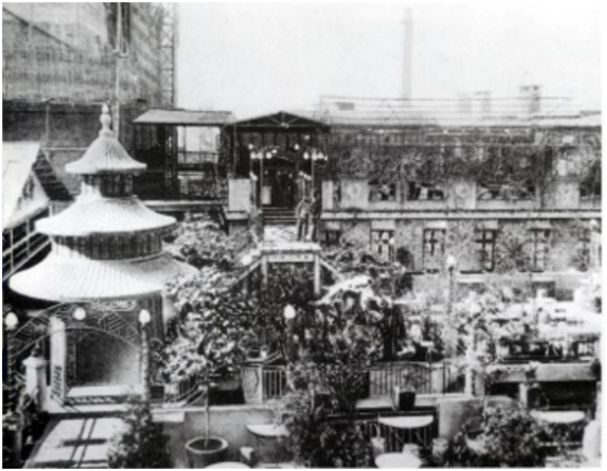 作为新式娱乐场所的游乐场,又称“公司乐园”,多设在百货公司楼顶阳台。每逢夏夜,到屋顶花园去喝一杯,一边乘凉、观景,一边看戏、听曲。永安公司屋顶建有绮云阁,先施公司则有摩星塔,观众居高临下,放眼四望,上海滩夜景尽收眼底,令人赏心悦目。