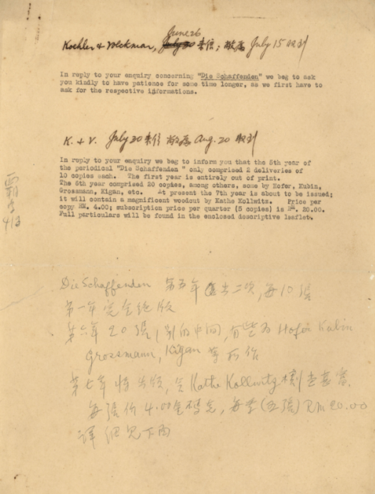 德国女艺术家凯绥·珂勒惠支是鲁迅十分欣赏的木刻家,"在女性艺术家之中,震动了艺术界的,现代几乎无出于凯绥·珂勒惠支之上"。鲁迅选取其版画21幅,1936年5月出版《凯绥·珂勒惠支版画选集》,仅印制了103部,极为珍贵。鲁迅在与吴朗西的信件中可见此书用纸,序文采用云母宣纸,"今送上六尺云化宣纸一百零五张,暂存社内,俟序文校毕后应用"。印刷《〈凯绥·珂勒惠支版画选集〉序目》及衬页,鲁迅"往九华堂买次单宣三十五张,抄更纸十六刀";封面所用磁青纸,由其三弟周建人购买。