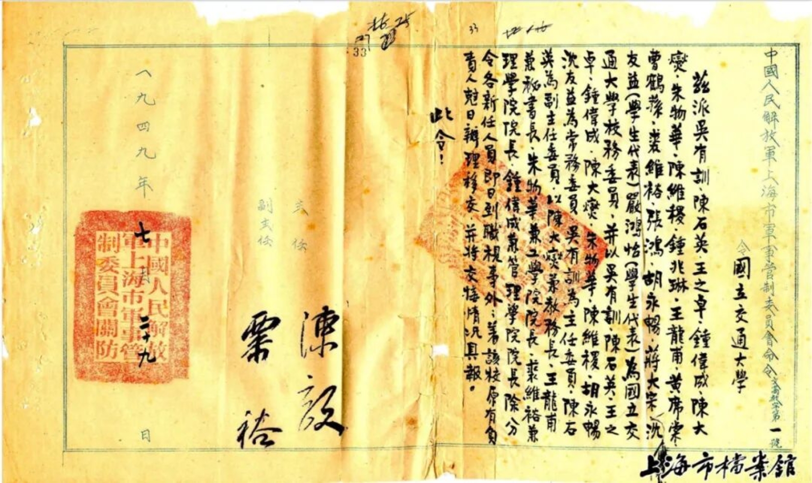 上海市军事管制委员会文高教字第一号令,组建交大校务委员会(上海市档案馆藏)