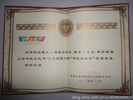 葛卫东荣获上海市民文化节“市民收藏家”称号的荣誉证书