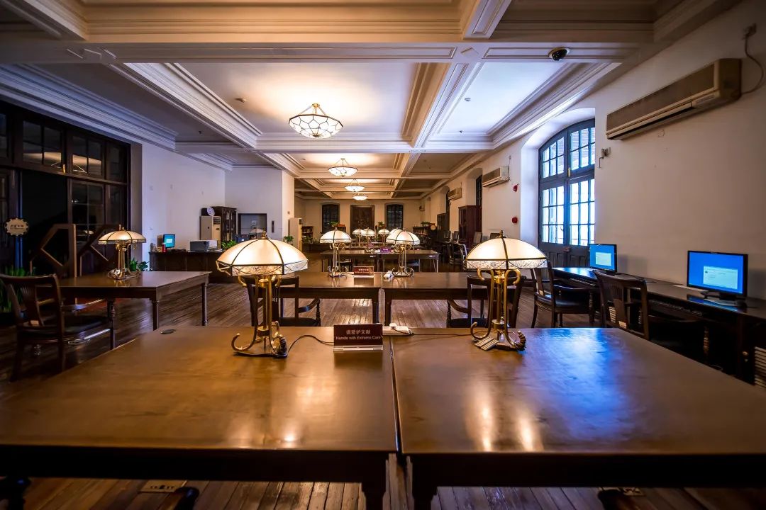 大书房两层的设计风格中西合璧。上层为西文书库,布局和藏书排架为梵蒂冈图书馆式样,木质书架自地板至天花板,共计12格,层高半腰处设内阁楼,设有木雕栏杆,沿书架围起形成上部走道,走道底部有铁栏杆支撑,东西两侧与正中有3部硬木扶梯与上部走道相连,形成上下整体的书架回廊结构。
