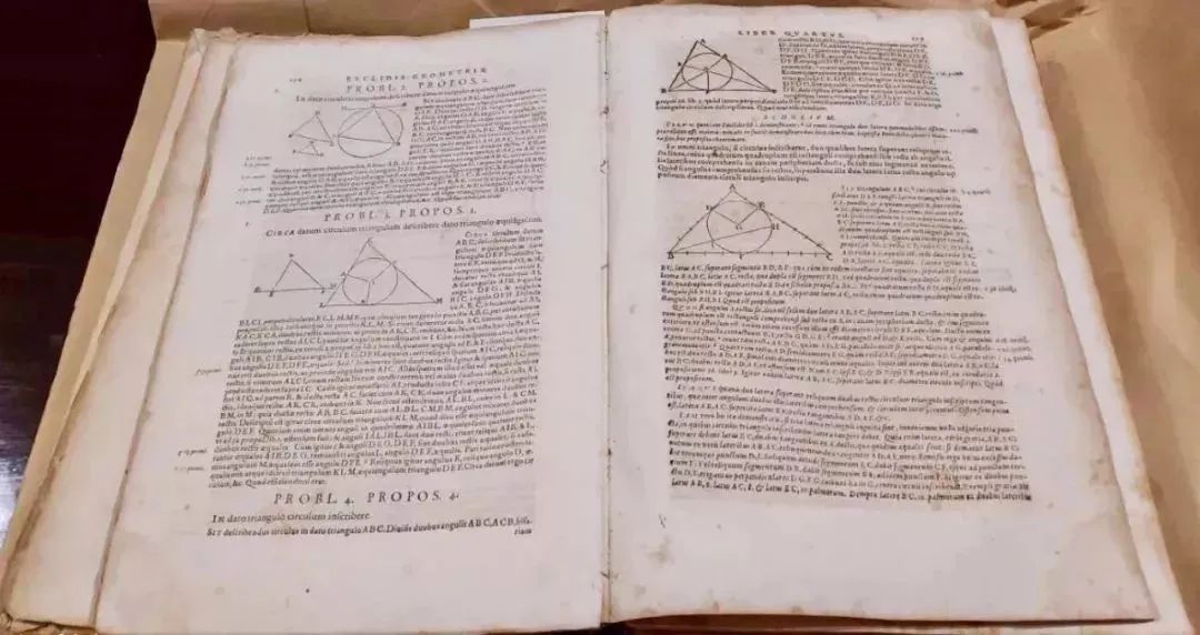 徐家汇藏书楼藏有许多历史悠久的珍贵藏品,令人大开眼界。《几何原本》带来了中西方文化交流的大变局。徐家汇藏书楼所藏1591年科隆版拉丁文《欧几里得几何原本》共十五卷,是德国数学家克拉维乌斯对欧几里得《几何原本》作的注释本。克拉维乌斯是十六世纪欧洲著名的数学家,也是利玛窦的授业恩师,这部著作是他根据欧几里得的《几何原本》整理、注释后编纂而成,共十五卷。徐光启和利玛窦正是以此为底本,翻译了其中的前六卷,可谓是《几何原本》的“原本”。