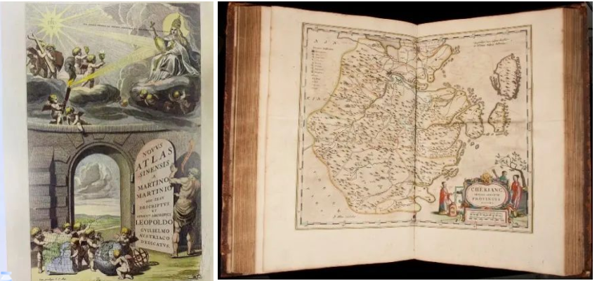 1655年荷兰阿姆斯特丹初版《中国新图志》,是欧洲第一部中国分省地图集。内有17幅地图,包括中国全图、明代“十五省”分图、附录的日本地图、以及地理志171页。它的作者意大利耶稣会士卫匡国采用当时最先进的测量仪器和测算方法,是17世纪欧洲了解中国地理必读的权威著作。