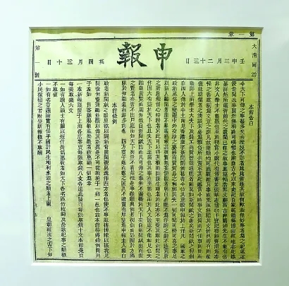 《申报》是近代中国发行时间最久、最具社会影响力的报纸之一。该报于1872年4月30日(清朝同治年间)在沪创办,展览中展出的《申报》创刊号单面印刷,八版,版式特别,接近正方形。1912年后成为报业巨子的史量才接手经营。1949年5月27日,《申报》正式停刊。该报有中国近现代史“百科全书”之称,因其影响之广,上海及江南一带,人们曾将报纸统称“申报纸”。