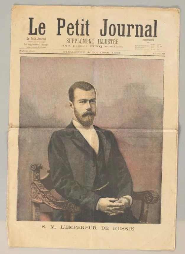Le Petit Journal《小日报》(1896年10月4日),1863年2月1日,法兰西第二共和国时期,创刊于巴黎。创办人是银行家米洛。法国最有影响的廉价报纸之一,当时售价仅5生丁,与英国便士报和美国美分报相似。1884年成为世界上第一份日销量逾百万的报纸,引领法国报业黄金时代。同年,增印每周副刊,在首尾或内页印制当时最前卫的彩色石印版画,记录国内外重大新闻事件。1944年8月终刊。这期头版为沙皇尼古拉二世的彩印版画。1896年10月5-9日,尼古拉二世偕皇后访问巴黎。