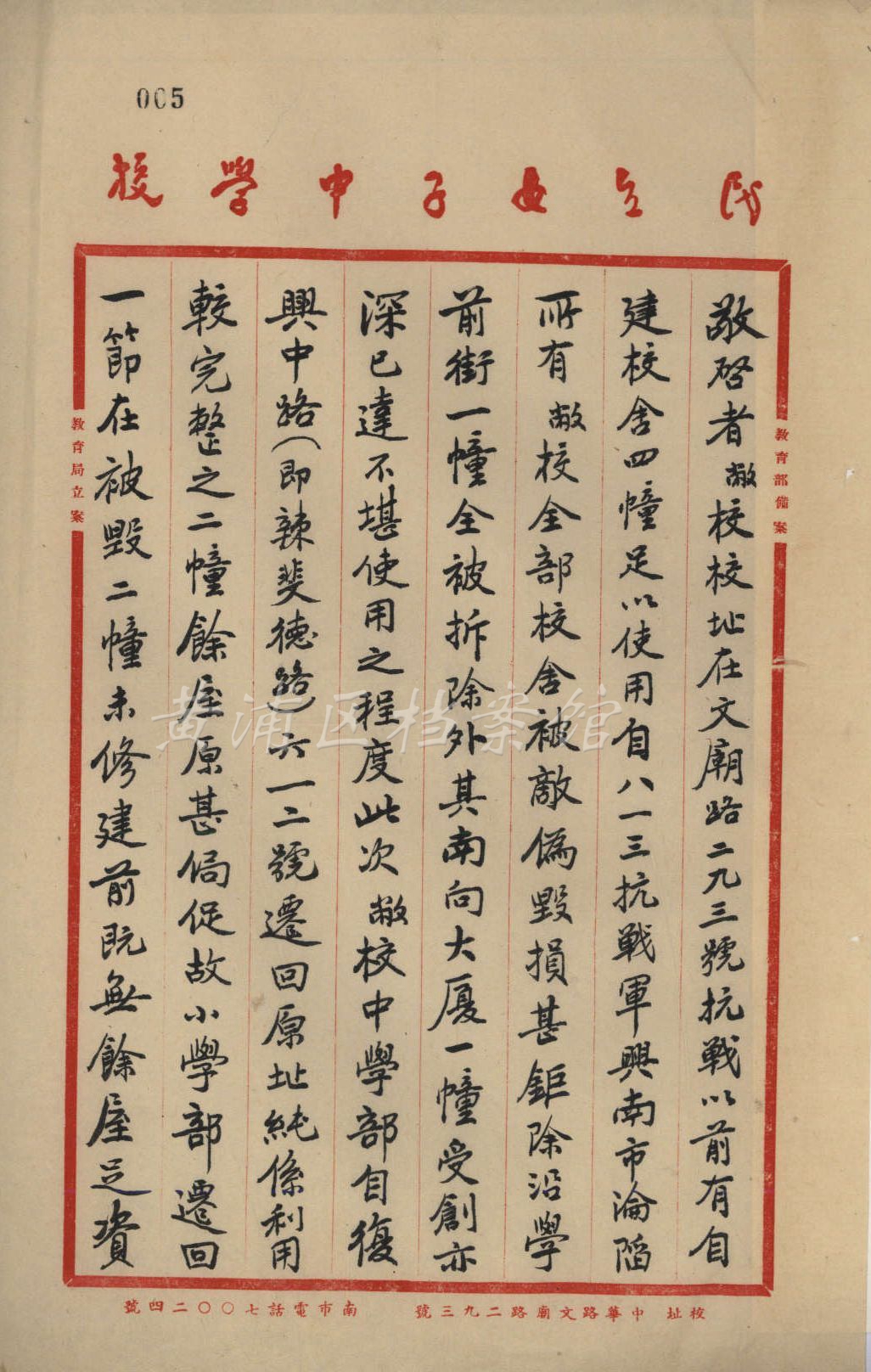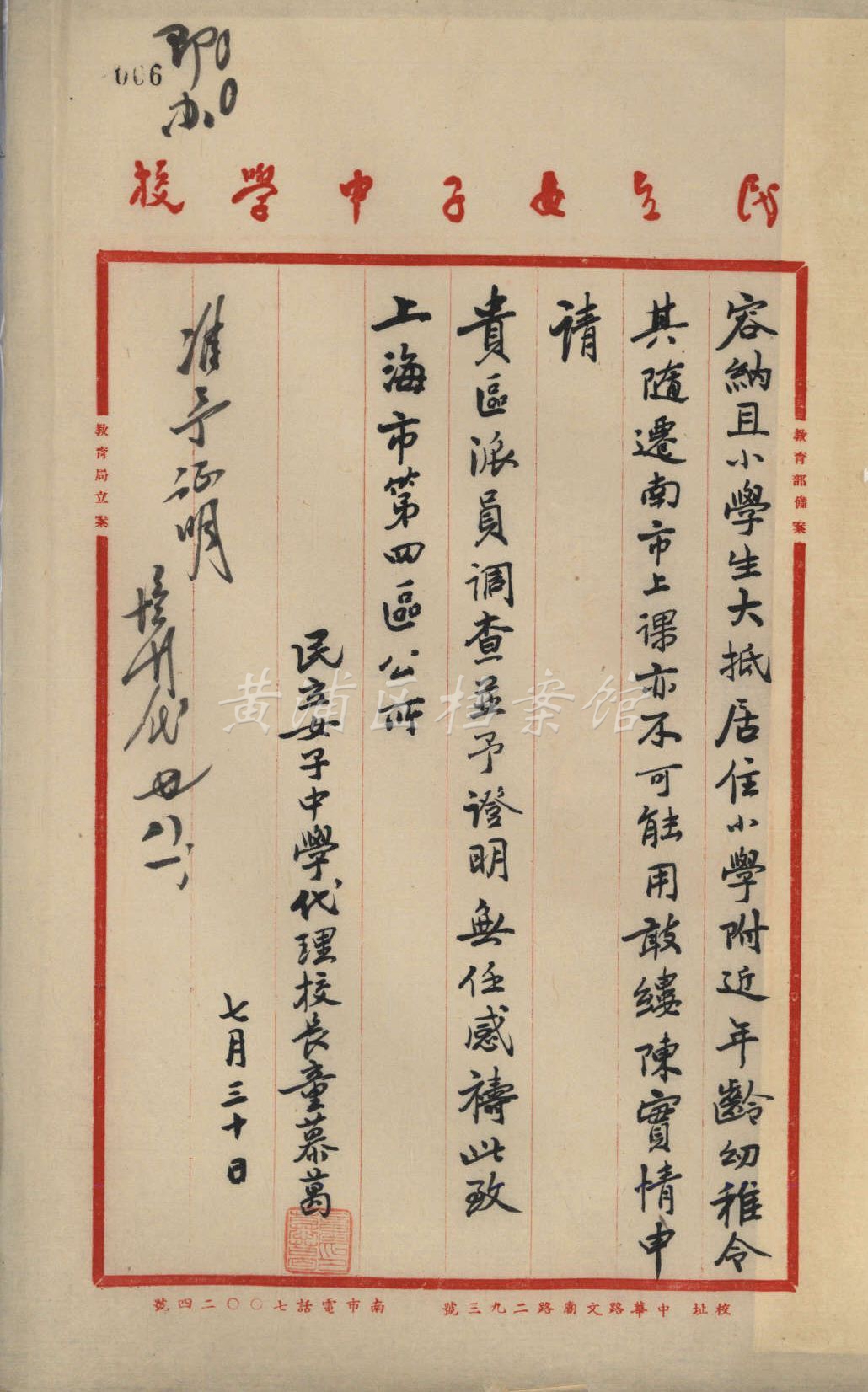 1906年,民立女子中学在南市西门外创办,1912年起在上海文庙西侧兴建校舍,遂成规模,是沪上为数不多的由国人创办的新式名校。八一三淞沪抗战期间,校舍被日军损毁,被迫迁往法租界辣斐德路612号(今复兴中路)等处办学,抗战胜利后迁回文庙路293号,现为上海市第十中学。