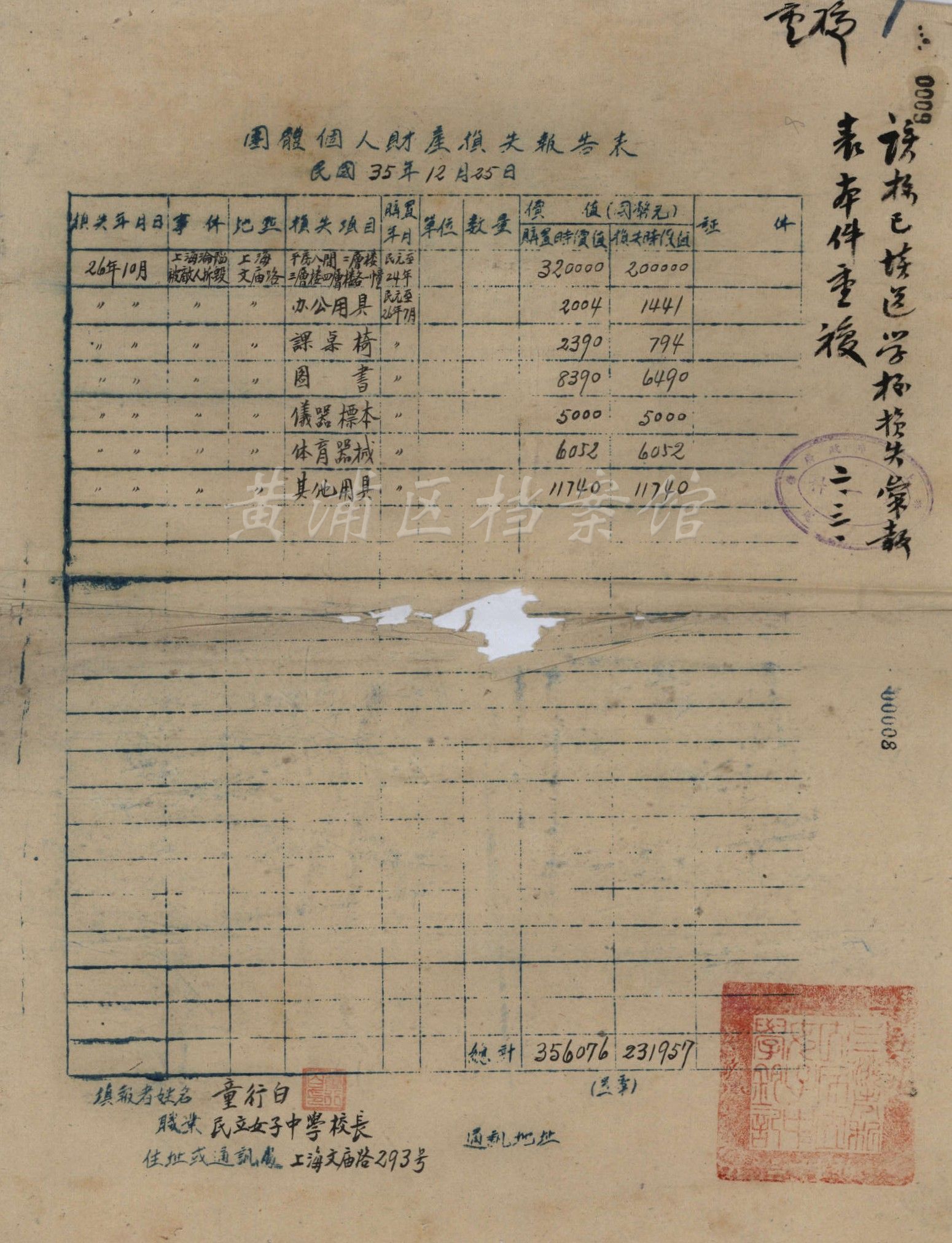 民立女中呈请证明校舍被毁情况报告和财产损失报告表
