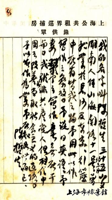田汉(陈哲生)在上海公共租界巡捕房的供录(上海市档案馆藏)