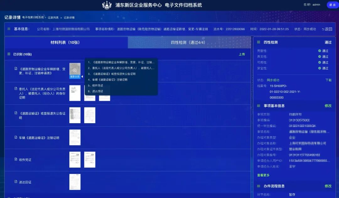 科研立项探索创新路径。建立档案主管部门、事项办理主体、事项权力主体的三方联动机制,聚焦“高效办成一件事”,共同研究“一网通办”在线政务服务电子文件归档问题。以实现“办结即归档”为目标,探索可信管理方面的具体技术方法和实现路径。2022年与区政务服务中心、区建交委共同完成国家档案局科技项目《基于AI技术在线政务服务电子文件归档智慧管理实现研究》,获上海市档案科技研究成果奖二等奖。电子文件全周期管理。选取试点进行电子文件全周期管理。前端业务系统配置标准化的电子文件归档子系统,后端建设馆室一体化平台,在线接收归档信息包。档案质量全过程管控。通过人工智能技术,做到档案质量全过程管控。档案数据自动分类整理、自动要素归集、自动线上归档、自动打包检测,实现归档工作无感管理。