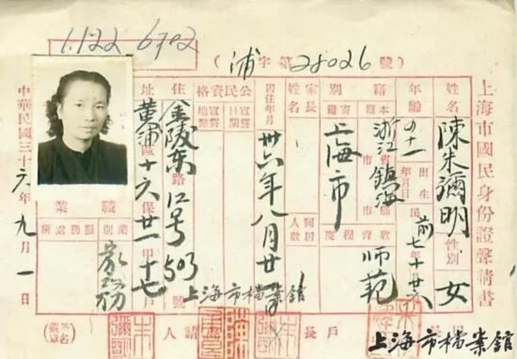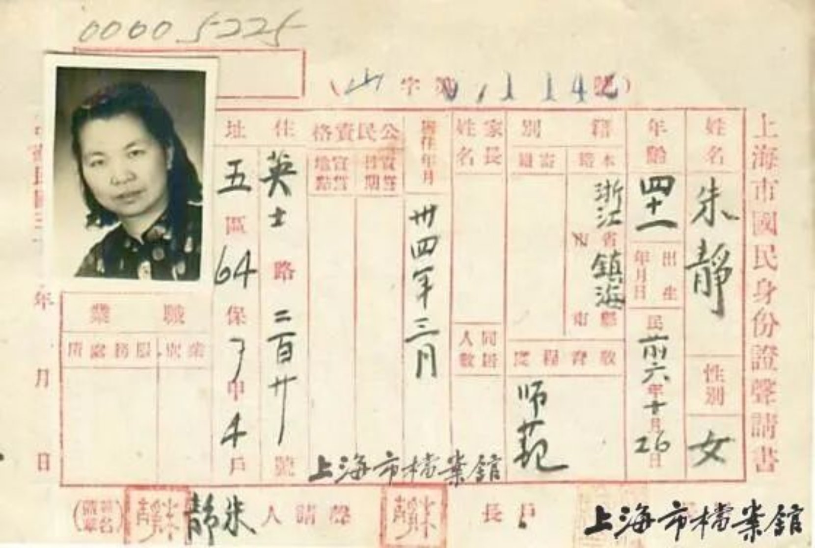 上海市国民身份证声请书——朱枫化名朱静、陈朱弥明
