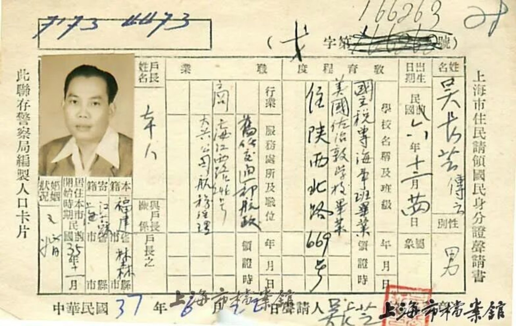 上海市住民请领国民身份证声请书——吴长芝