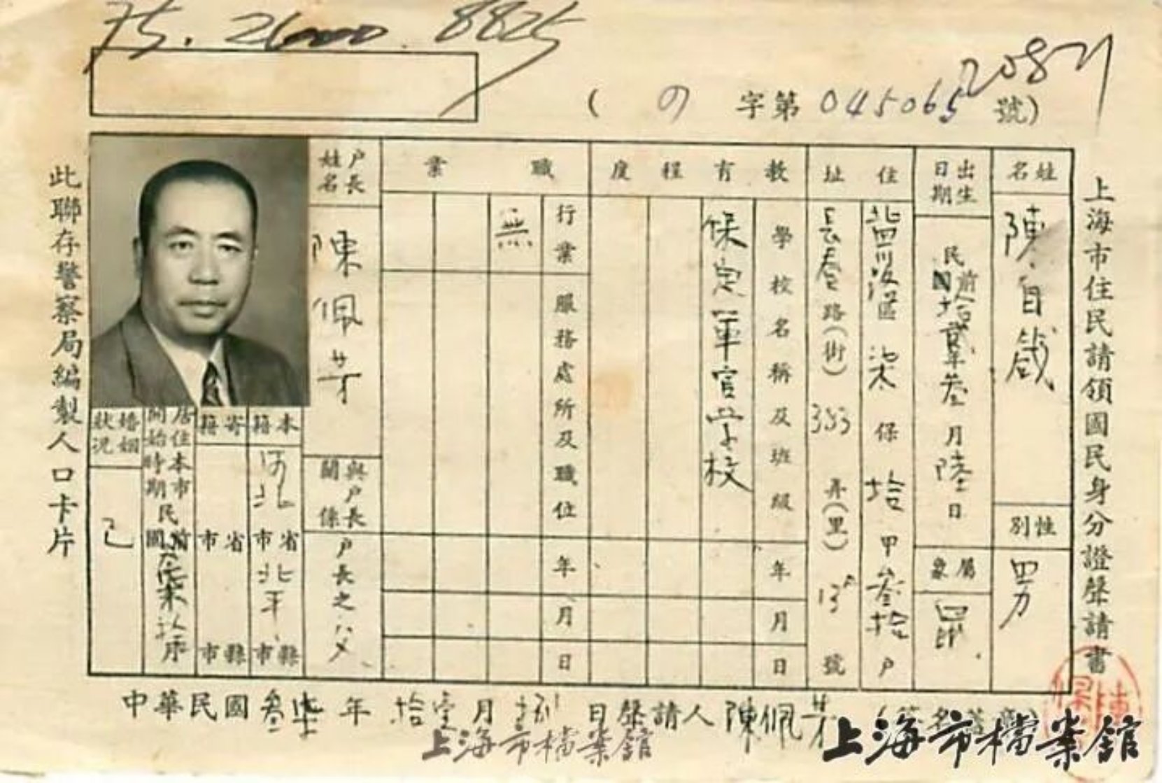 上海市住民请领国民身份证声请书——陈自箴(陈宝仓)