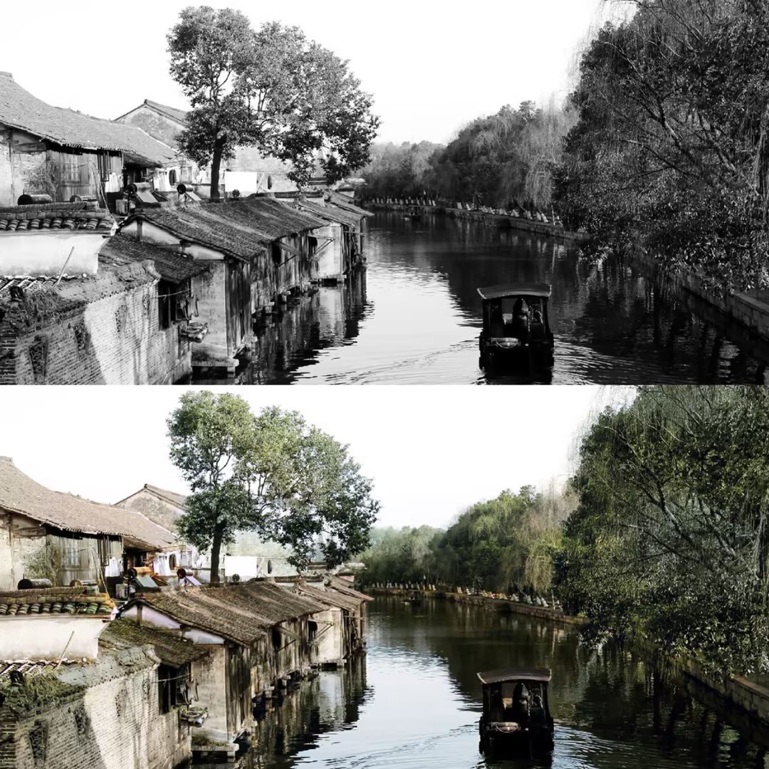 应用多特征融合图像超分辨率模型算法对图像进行上色处理前后对比