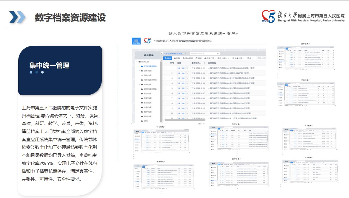 复旦大学附属上海市第五人民医院以服务临床一线为核心,以全面升级数字档案室管理系统为契机,实现电子公文、住院医师培训等电子文件在线归档,积极扩展传统载体档案数字化范围,建立较为齐全的档案数字资源门类。数字档案室在医院管理、科学决策、建设推进、运行维护等方面发挥了重要作用。