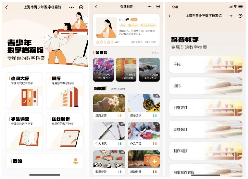 以市档案馆馆藏档案资源为基础,结合青少年兴趣特点,运用动画、3D模型、人机交互、VR/AR实景呈现等多种数字技术和展示方式,设计了包含“城市记忆 时光珍藏”常设展可视化导览、上海文化和“四史”教育系列档案课程、档案科普教育课程、成长档案制作课程等栏目的系统平台,具有综合性、定制化、高互动性、可扩展性特点,为青少年爱国主义教育提供丰富资源和多元化服务手段,进一步拓展了档案馆的社会教育功能。