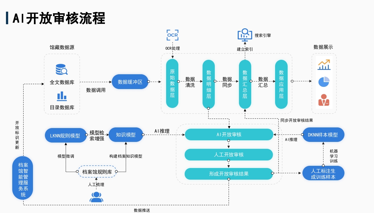 在深度学习算法基础上优化了适用于本馆档案开放审核的深层知识感知神经网络算法,构建了档案开放审核规则库、知识库及人工智能开放审核模型,开发运行了智慧档案开放审核系统,优化了工作规则和流程,实现人工复审实时交互,辅助区档案馆开展30余万件档案开放鉴定任务,提升了档案开放审核准确率,取得了一定的经济社会效益,对其他档案馆开展相关研究和业务实践具有较高参考借鉴意义。