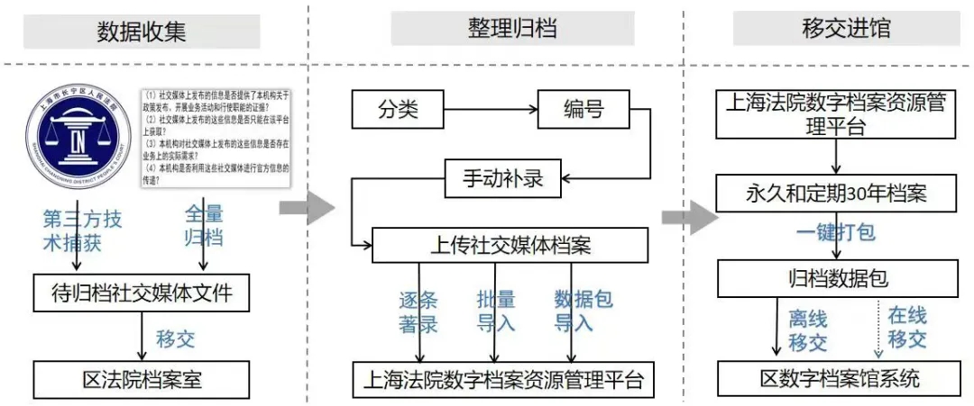 以区政务服务单位为重点研究对象,选取三家具有代表性的试点单位,分别开展社交媒体文件归档管理实践,制定了《长宁区政务社交媒体文件材料归档指南》,界定了社交媒体文件材料归档范围和保管期限,构建了具有可操作性的社交媒体档案管理流程,优化完善了区数字档案馆系统功能,实现社交媒体档案接收进馆,为该类档案资源收、管、存、用提供了实施路径和实践案例。