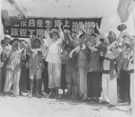 解放初期,上海五金行业工人先后为治理淮河工程、河北官厅水库等工程的修建承担了大量机械设备的生产任务,有力地支援了我国水利工程建设。图为皖北润河集水闸工地的民工们欢迎上海工人。