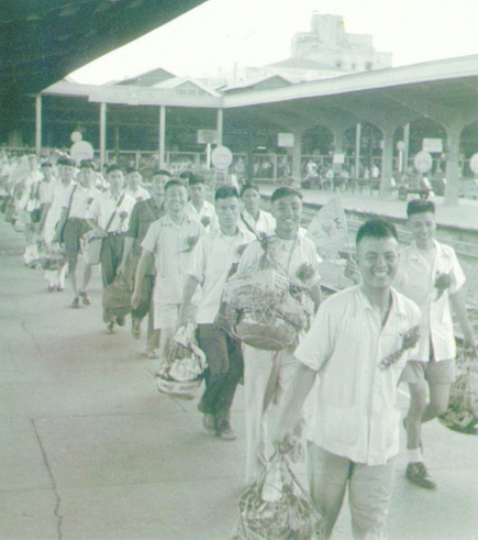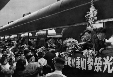 1950年到1958年,上海动员赴外地参加工农业建设的劳动者共计150万人以上。图为1954年7月2日,参加第一批重点建设的上海技工与亲人在车站告别。