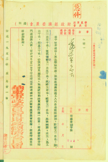 上海以国家重点建设项目为重,克服困难,全力以赴支援武钢、包钢、鞍钢、本钢、一汽等重点建设项目。此件为《华东军政委员会财政经济委员会关于动员技工参加鞍钢建设的通知》。