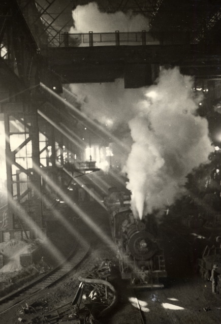1958年8月,货运列车在鞍钢宏大的厂房内行驶。