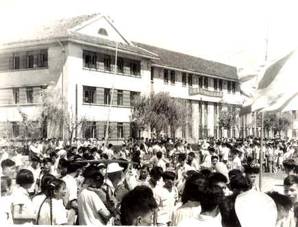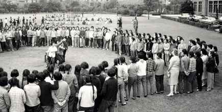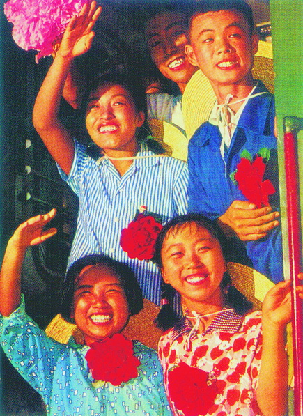 1964年5月22日,阿尔巴尼亚妇女代表团观摩市三女中学生的课外活动。学生们在草坪上演出活报剧,宣传响应党的号召到新疆去。
