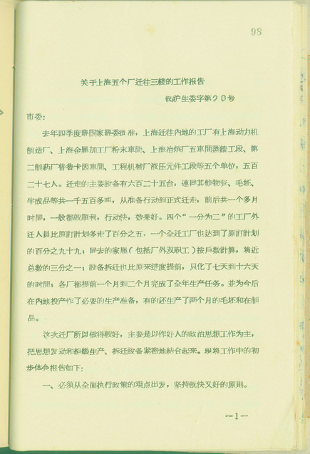 上海支援全国三线建设工作于1964年第四季度启动。截至1966年第一季度,上海共完成搬迁工厂66家。此件为《上海市工业生产委员会关于上海五个厂迁往三线的工作报告》。