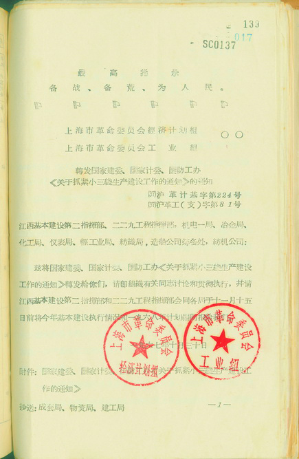 上海派出大批人员到“大三线”与“小三线”,并将许多地方建成综合性后方工业基地。此件为《关于抓紧小三线生产建设工作的通知》。