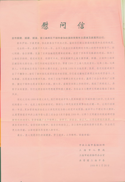 1999年,上海市委组织部致援藏、援疆、援滇、援三峡库区干部和参加赴滇扶贫青年志愿者 及家属的慰问信