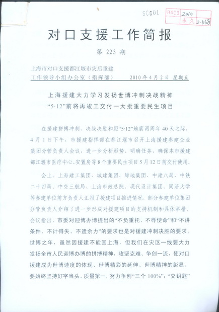 对口支援工作简报第223期——上海援建大力学习发扬世博冲刺决战精神“5.12”前将再竣工交付一大批重要民生项目