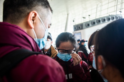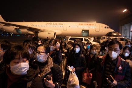 2020年1月24日,上海第一批支援武汉医疗队在虹桥机场停机坪准备登机。(解放日报记者董天晔摄)