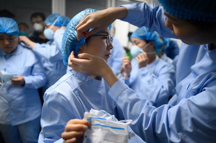2020年1月26日16:42,金银潭医院北三病区,第一批上海医疗队的护士们首次进入病房当班,气氛有些紧张。(解放日报记者董天晔摄)