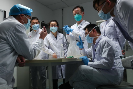 2020年2月9日,上海中山医院的医生与武汉大学人民医院东院区医生交接患者信息。(解放日报记者赖鑫琳摄)