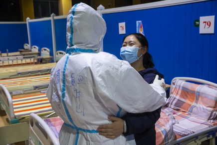 2020年3月9日,武昌方舱医院,休舱前夜,医护人员和患者拥抱话别。(解放日报记者赖鑫琳摄)