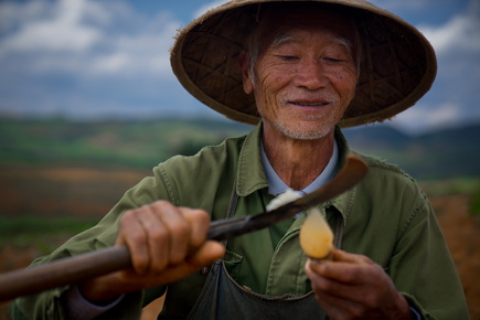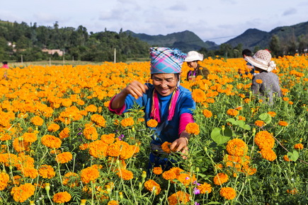 云南丘北县农户在上海援建的黄菊花产业基地劳动