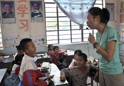 青年志愿者在云南西双版纳州乡村小学开展支教服务,帮助小学生纠正英语发音。