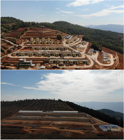 注重抓好易地扶贫搬迁配套,通过发展产业帮助贫困群众“搬得出、稳得住、能致富”。图为上海援建的易地搬迁的云南武定县松包园村新貌(上图)和建设中的配套生猪养殖基地(下图)。
