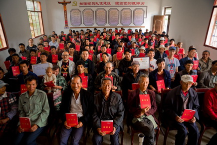 拼多多公司落地云南丘北县,“多多农园”扶贫项目的建档立卡户股东领取股权证。