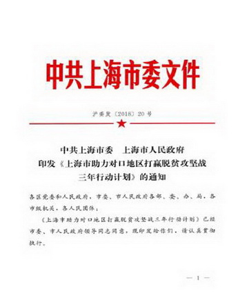2018年,中共上海市委、上海市人民政府印发《上海市助力对口地区打赢脱贫攻坚战三年行动计划》。