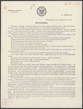 1918年9月26日,美国华盛顿针对西班牙流感的防护指示(部分)